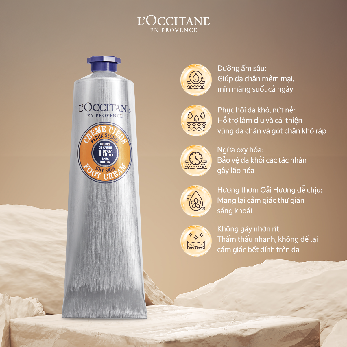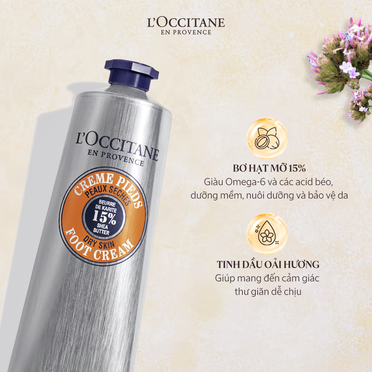 Kem Dưỡng Da Chân Bơ Đậu Mỡ Shea Butter Foot Cream giúp cấp ẩm, nuôi dưỡng đôi bàn chân mềm mịn, tạm biệt làn da khô ráp. Với công thức giàu thành phần Bơ Đậu Mỡ (15%) giúp tăng cường độ ẩm, bảo vệ làn da chân mềm mại. Kết hợp Tinh Dầu Hoa Oải Hương tạo cảm giác thư giãn, xoa dịu làn da mệt mỏi và Chiết Xuất Hoa Kim Sa giúp giảm viêm và kích ứng da. Kết cấu kem mỏng nhẹ, nhanh chóng thẩm thấu vào sâu dưới da, không gây nhờn rít, cho ta cảm nhận được sự thoải mái trong từng bước chân.