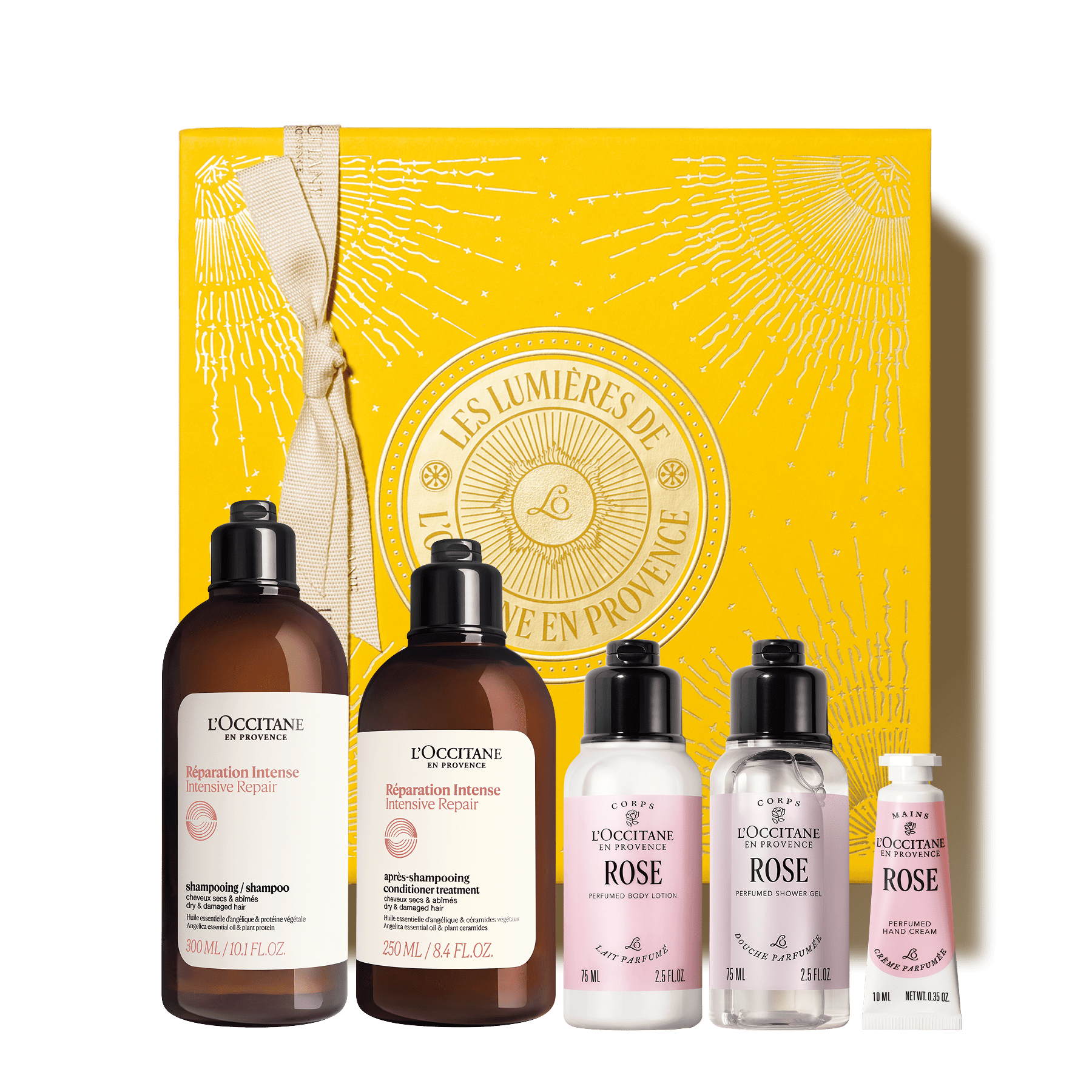 Set Chăm Sóc Tóc & Cơ Thể (Dành Cho Tóc Hư Tổn) L'Occitane Intensive Repair Hair & Bodycare 1. THÔNG TIN SẢN PHẨM - Thương hiệu: L'Occitane - Xuất xứ thương hiệu: Pháp - Nơi sản xuất: Pháp - Hạn sử dụng: 03 năm kể từ ngày sản xuất - Set sản phẩm gồm: + Dầu Gội Phục Hồi Chuyên Sâu 300ml + Dầu Xả Phục Hồi Chuyên Sâu 250ml + Sữa Dưỡng Thể Hoa Hồng 75ml + Sữa Tắm L'OCCITANE Hương Hoa 75ml + Kem Dưỡng Da Tay Hoa Hồng 10ml + Gói Mặt Nạ Phục Hồi Chuyên Sâu 6ml + Hộp quà L'Occitane